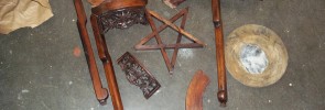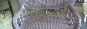 This is a hanging swing from the early 1900s that we restored, fashioning by hand all the pieces that were broken or rotting throughout the piece. We then sealed the fiber and painted it with a special paint.